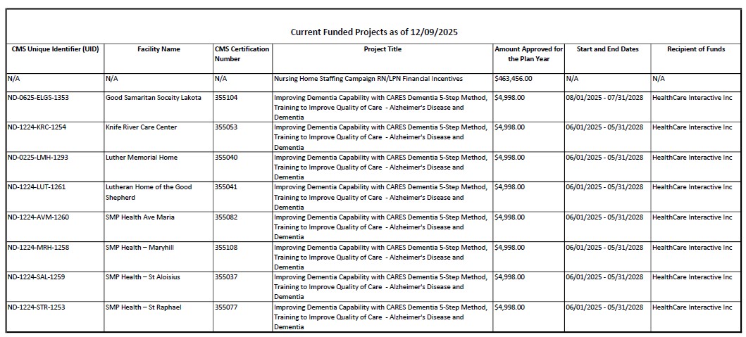 North Dakota’s Civil Money Penalty Reinvestment Program (CMPRP) accepts applications year-round for projects that improve the quality of care and quality of life for residents in certified nursing facilities. Eligible applicants may include nursing homes, nonprofit organizations, resident and family councils, academic institutions, and other entities partnering with North Dakota facilities. Projects must align with federal CMS guidelines and provide benefits that go beyond standard facility responsibilities—such as staff training, resident-centered care initiatives, culture-change programs, quality-of-life enhancements, and technical assistance. Applicants are required to submit a detailed project description, measurable goals, a budget, and letters of support from participating nursing facilities. Funded projects are publicly reported to ensure transparency and to highlight initiatives that support innovation and resident well-being across the state. Additional information regarding the program and most current CMS CMPRP application are available at: www.cms.gov/Medicare/Provider-Enrollment-and-Certification/SurveyCertificationGenInfo/LTC-CMP-Reinvestment.